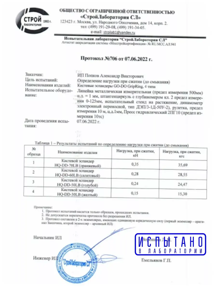 Таким образом, дополняя состав эспандера из ТПЭ, силикон придаёт изделию более высокую стойкость к износу и сжатию. Это первый в России кистевой эспандер, прошедший независимые лабораторные испытания на определение нагрузки при сжатии.