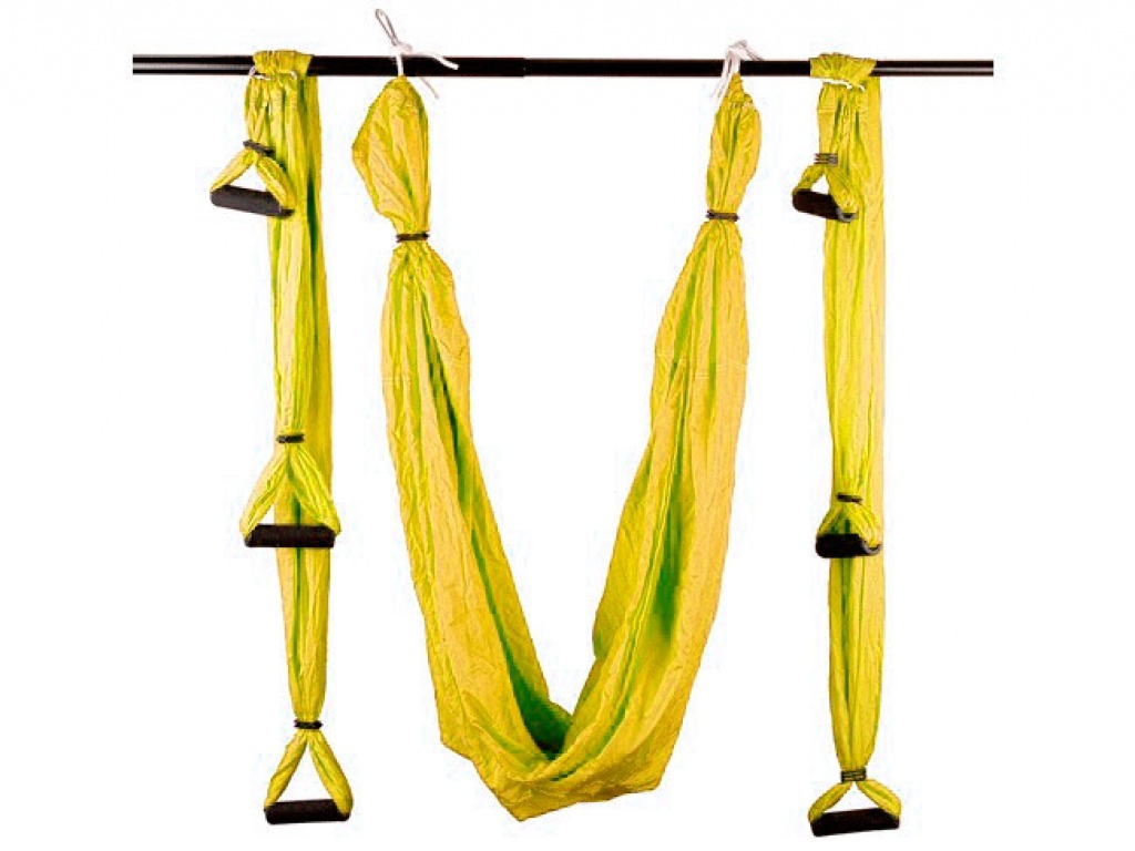 Гамак изготовлен из легкой, тонкой и в тоже время очень прочной синтетической ткани. Данная ткань хорошо отталкивает загрязнения и очень простая в уходе. Применяется для занятий аэройогой. В комплект карабины для креплений не входят.
