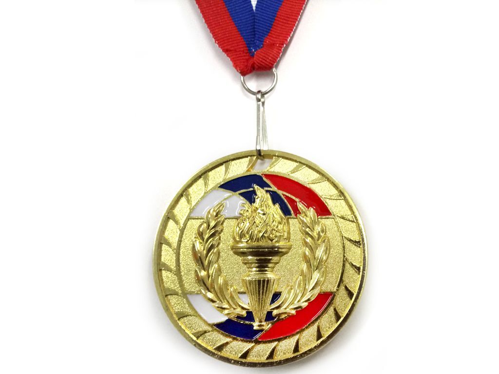 на матовом фоне, в сочетании с глянцевым покрытием, олимпийский огонь с венком из лавровых листьев и эмалью триколор