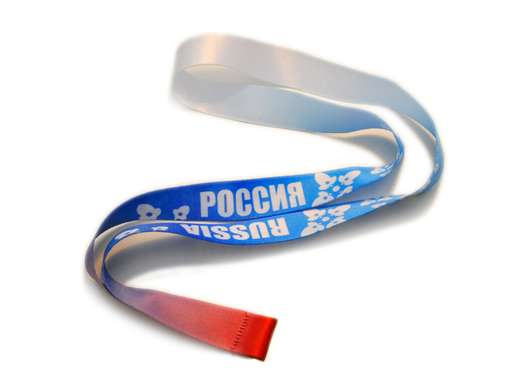 лента выполнена в стиле российский триколор три цвета плавно переходят по длине ленты, на ленте оригинальный принт и надпись «РОССИЯ» «RUSSIA»