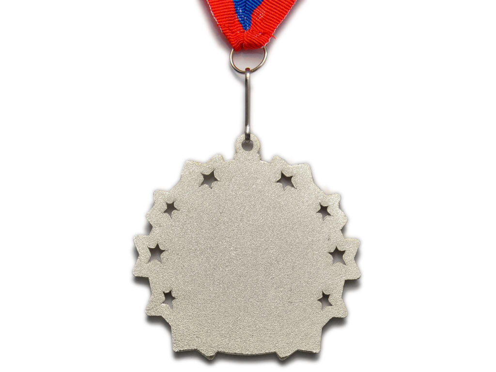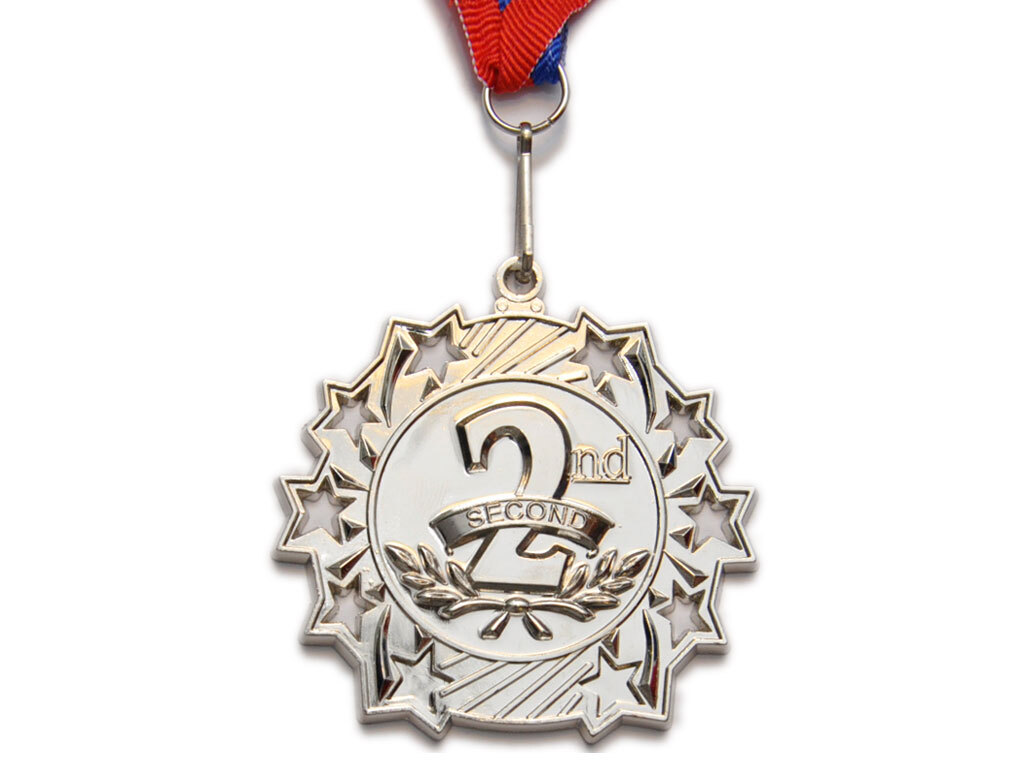 Медаль металлическая с тиснением и полыми вставками в виде звезд «2 место» серебро.