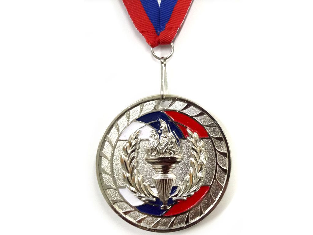 на матовом фоне, в сочетании с глянцевым покрытием, олимпийский огонь с венком из лавровых листьев и эмалью триколор