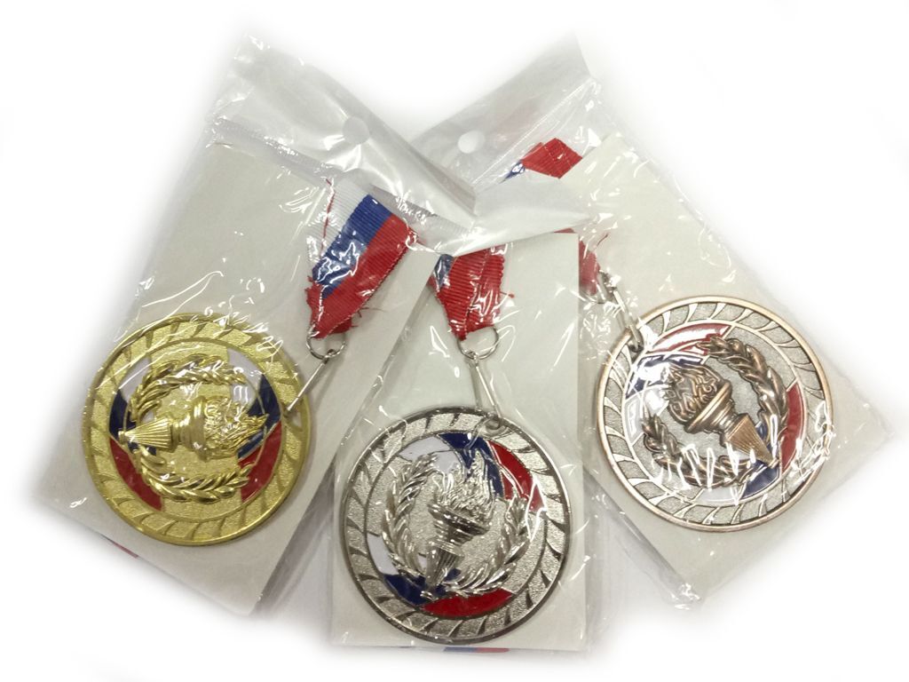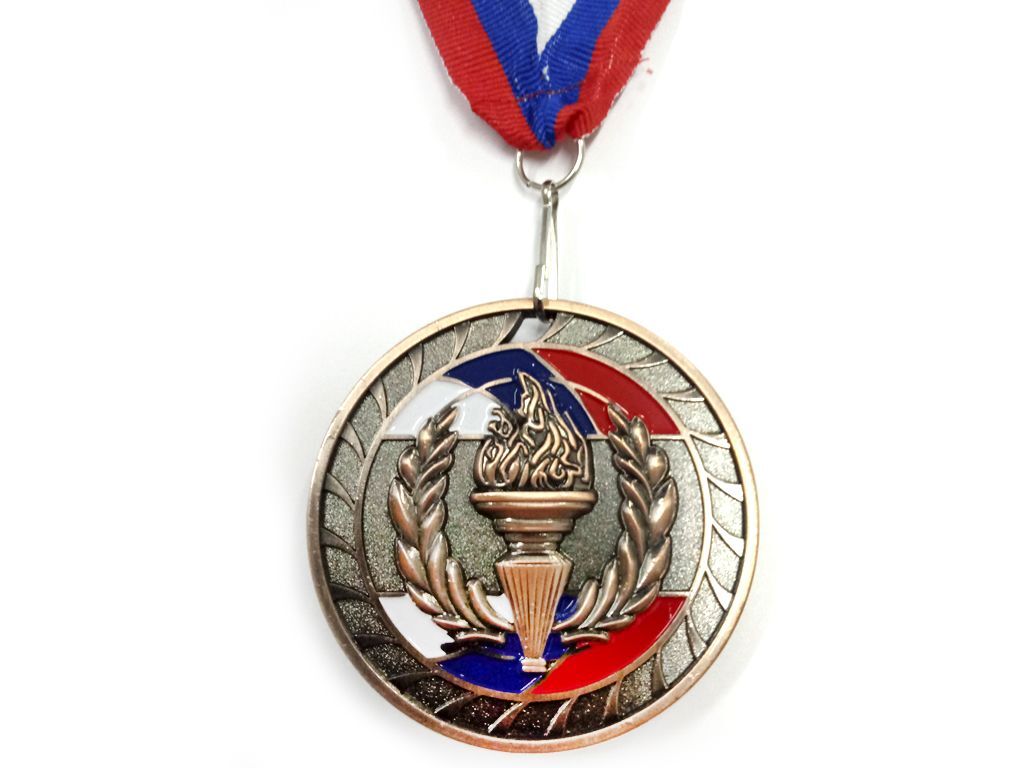 на матовом фоне, в сочетании с глянцевым покрытием, олимпийский огонь с венком из лавровых листьев и эмалью триколор