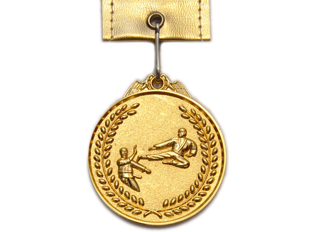 две лавровые ветви обрамляют двух каратистов в спаринге
