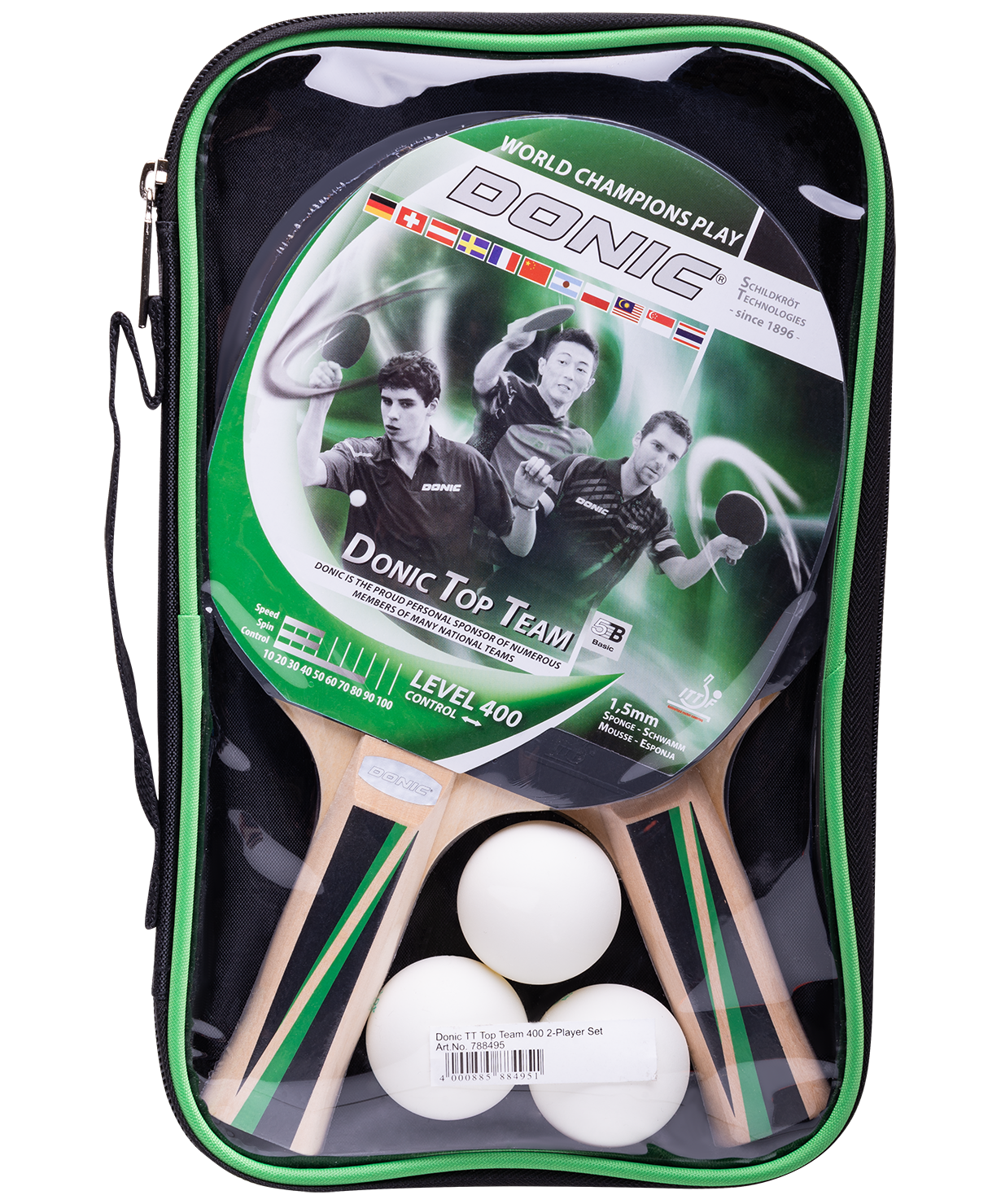 Набор для настольного тенниса Top Team 400 от всемирно известного немецкого бренда Donic-Schildkr?t состоит из двух ракеток для пинг-понга Top Team 400 и трех мячей 1*Elite из ABS-пластика. Ракетки и мячи прекрасно подходят начинающим игрокам, которым требуется овладеть базовой техникой игры. Рукоятка теннисной ракетки для настольного тенниса анатомической формы удобно располагается в руке, не доставляя дискомфорта. В комплекте идет брендированный чехол из ПВХ.