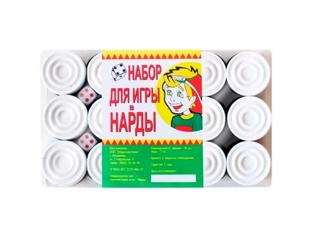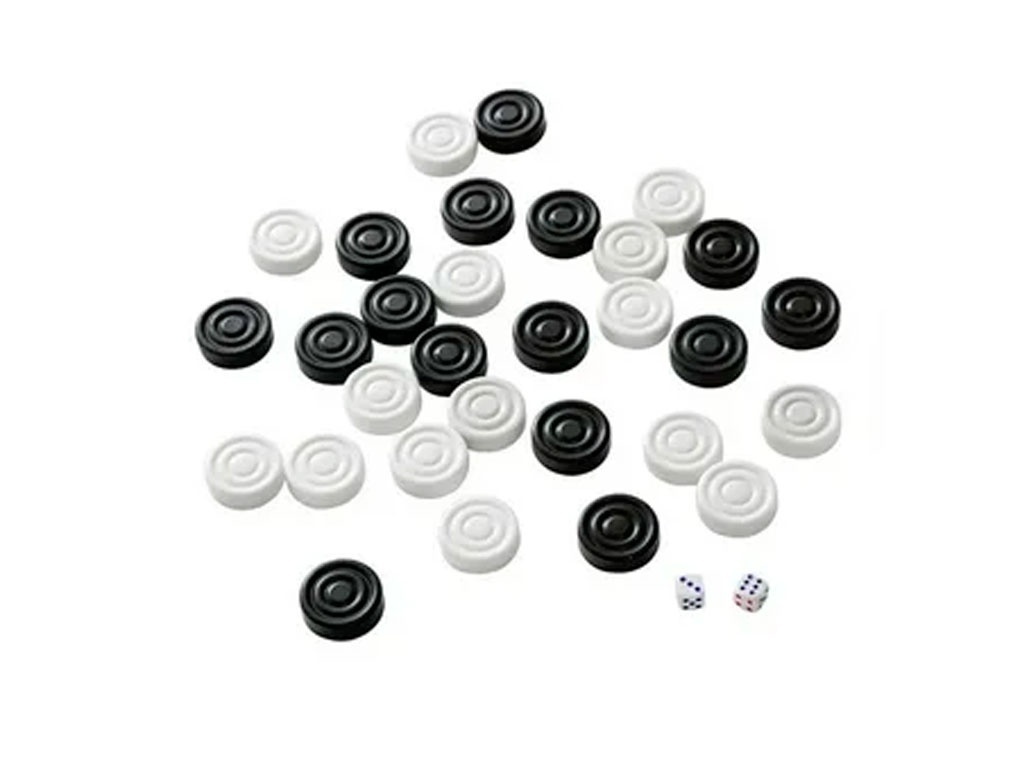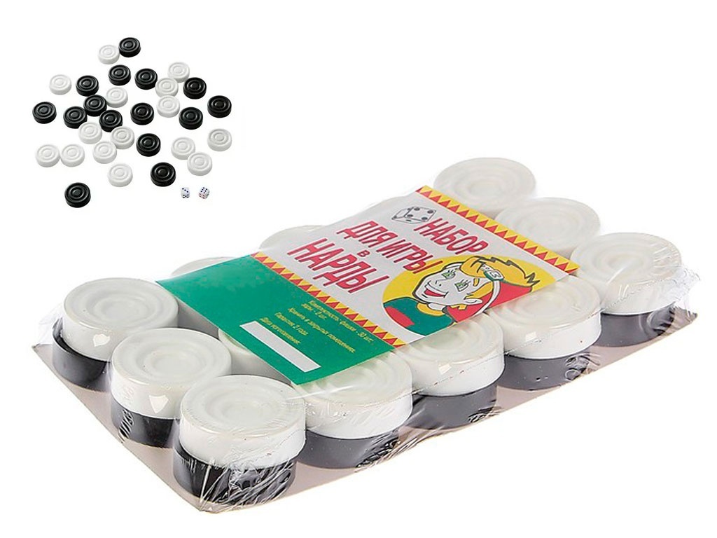 Набор для игры в нарды. В комплекте 15 черных и 15 белых фишек, а так же 2 кубика.