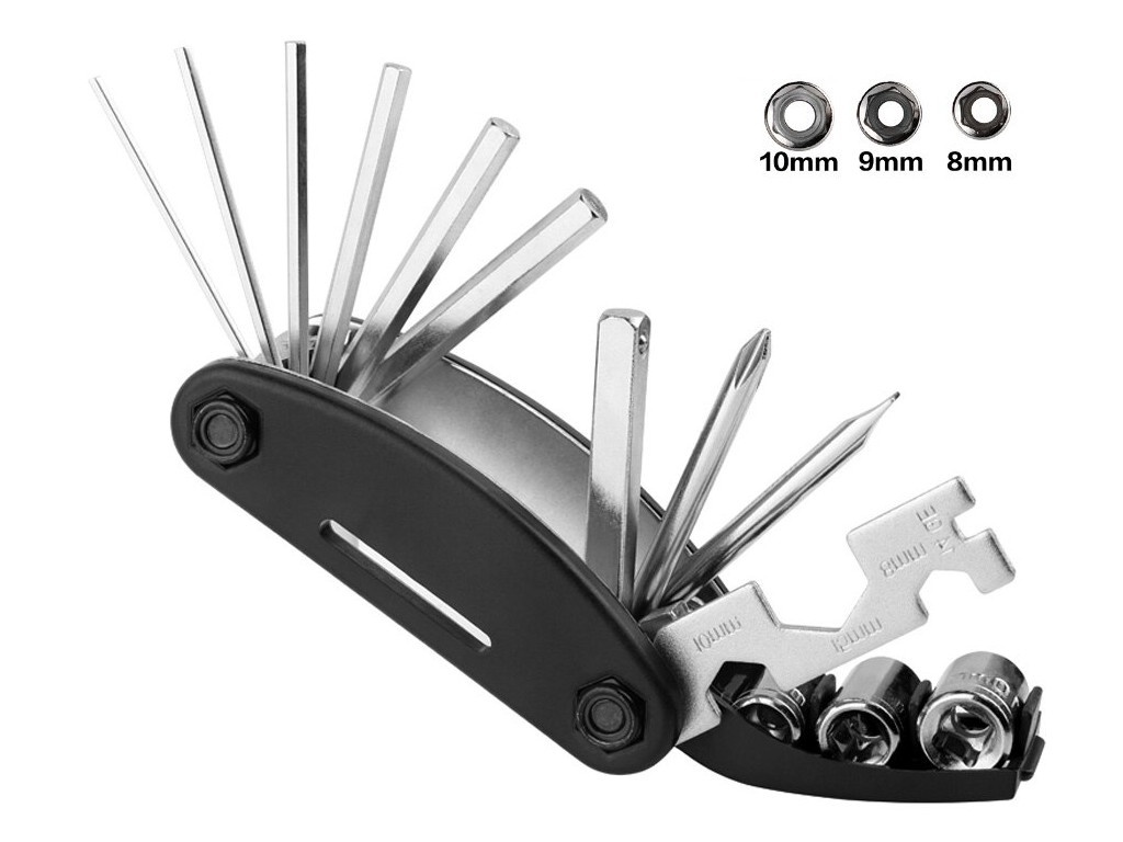 внешние шестигранные ключи - 6 мм, 5 мм, 4 мм, 3 мм, 2,5 мм, 2 мм; головки 10 мм, 9 мм, 8 мм; шлистовая, крестовая отвёртки, велоключ внешний 15 мм, 10 мм, 8 мм