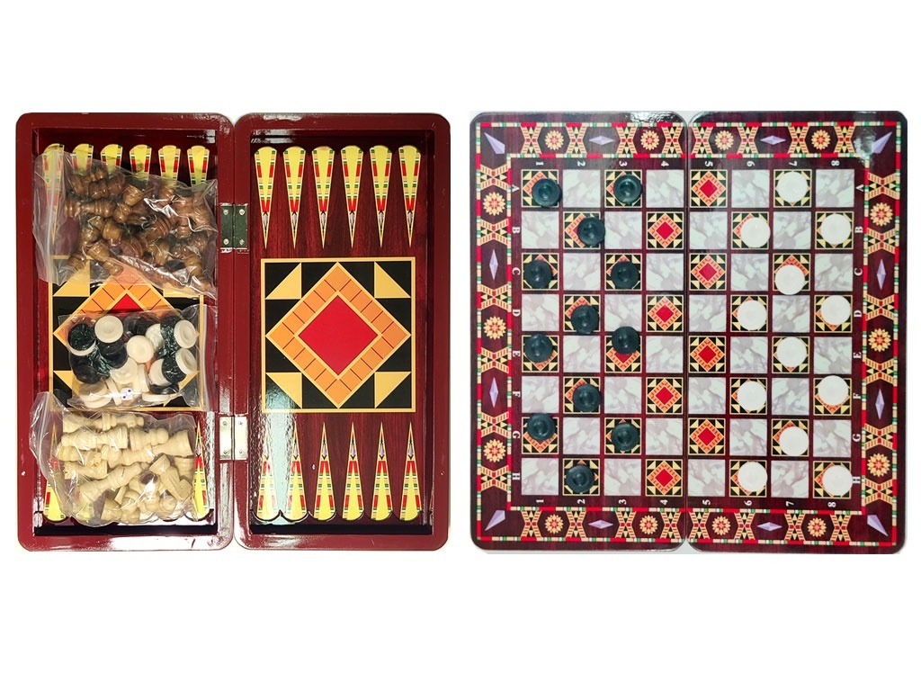Игра 3 в 1 большая станет самым удачным приобретением для тех, кто любит настольные игры. В отличие от других моделей, в данном варианте удалось объединить сразу три игры - нарды, шашки и шахматы. Теперь у игроков всегда есть выбор, за какой игрой провести свободное время. Модель игры удобна тем, что компактна, и ее можно взять с собой в гости, на природу или в путешествие. Набор включает все необходимое для игры: расчерченные доски, деревянные фигуры для шахмат, универсальные деревянные фишки для игры в шашки и нарды, два игральных кубика (зара)