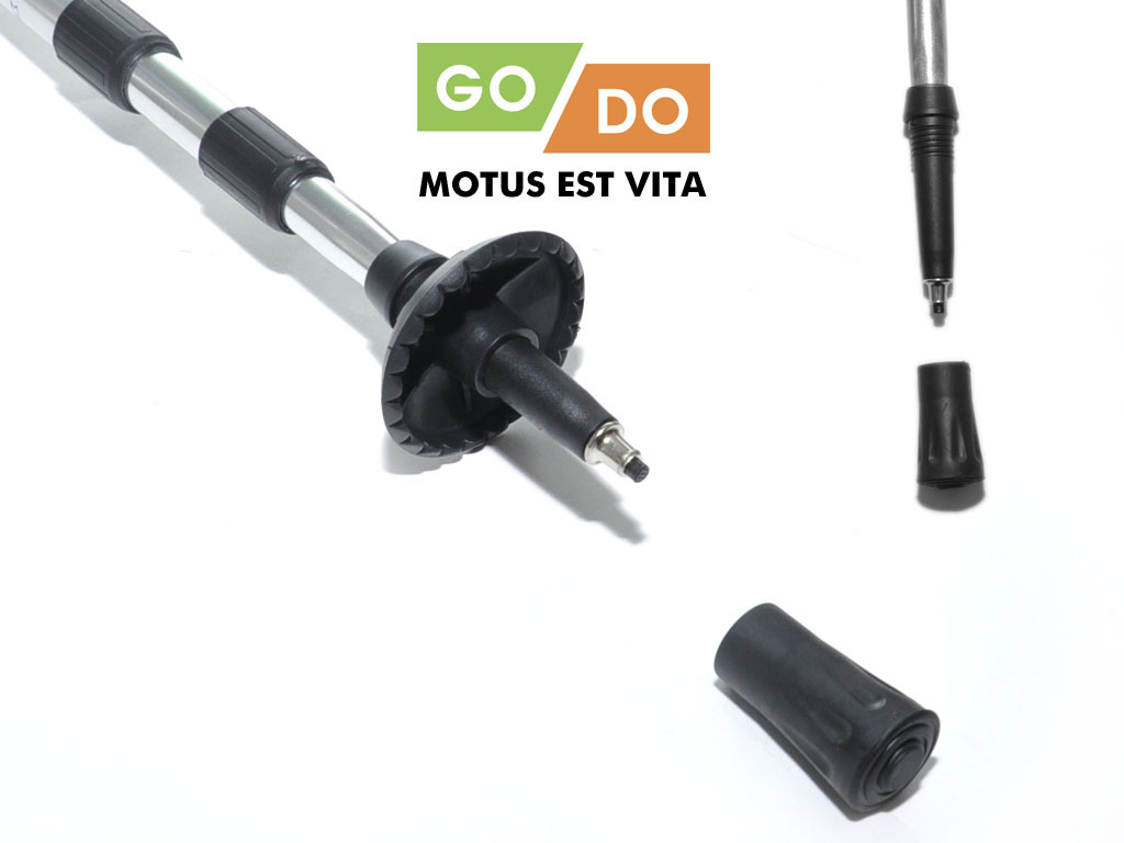 Палки треккинговые GO DO (110 - 135 см). Наконечник из карбида обеспечивает оптимальное сцепление с каменистой и ледяной поверхностью. В комплекте – резиновый наконечник "капля" для использования в помещении или на тротуаре. Защитное кольцо предназначено для использования на мягком грунте или снегу. Трехсекционная система регулировки с защелками.