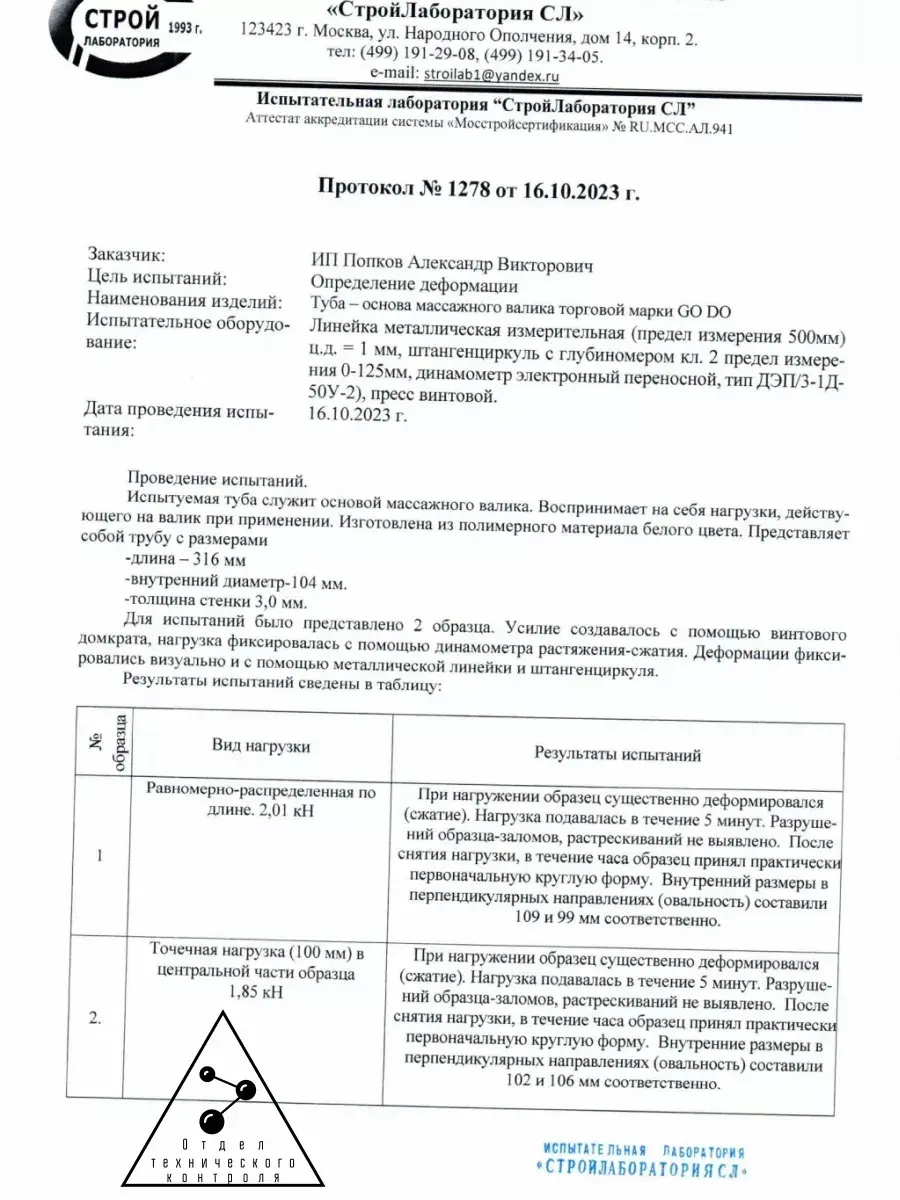 *Нагрузка. Валик представляет собой полую трубу длиной 33 см и диаметром 14 см, изготовленную из PVC (поливинилхлорида) с добавлением различных веществ, таких как пластификаторы, стабилизаторы, пигменты и антипирены. Эти добавки позволяют достичь высоких показателей по нагрузке на валик. Состав поверхности валика — EVA (этиленвинилацетат), который обладает отличными амортизирующими свойствами и гипоаллергенен. Из этого материала также производят медицинские протезы, протекторы и бандажи. Лабораторные испытания показали, что каркас валиков деформируется, но не разрушается при сжатии. После снятия нагрузки каркас принимает практически первоначальную форму.